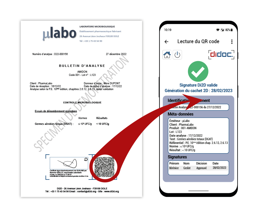 Di2D spécialiste de la 21 CFR Part 11, développe depuis 2000 des applications pour signer des certificats d’analyse ou des procédures qualité pour des sites pharmaceutiques. Bien que les auditeurs ANSM et FDA soient satisfaits par ce processus de signature, nous estimons que la manifestation de la signature par QR Code est une avancée majeure pour la sécurité d’un document.
